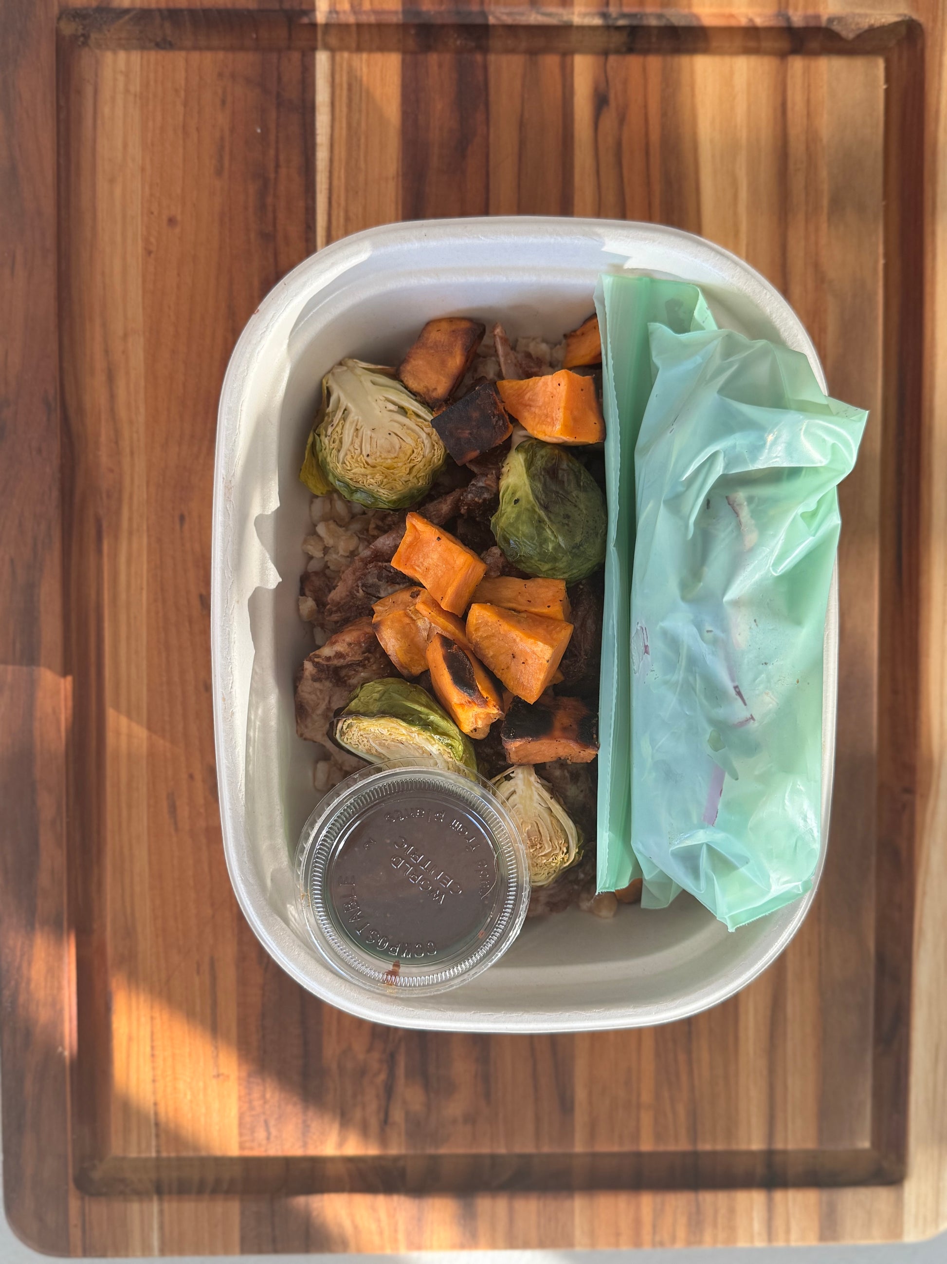 Tender balsamic-fig glazed pork served over hearty farro with roasted Brussels sprouts and sweet potatoes. Finished with fresh arugula, shaved red onion, rosemary, and an extra drizzle of our house balsamic fig glaze. Comforting, seasonal, and full of rich natural sweetness.